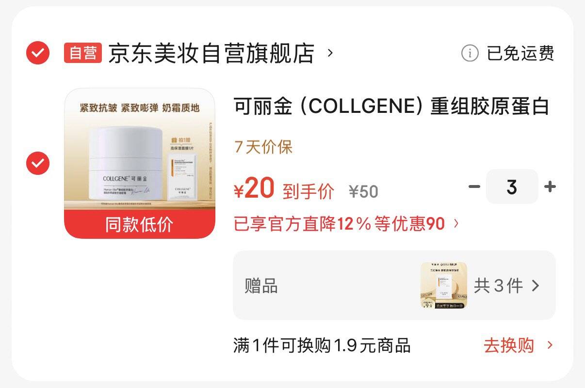 领150-72券 可丽金重组胶原蛋白面霜15g 拍3件60亓 折20亓/件好单发报员2026年03月07日 10:030举报 领150-72券https://u.jd.com/NrasH61可丽金重组胶原蛋白面霜15g拍3件60亓 折20亓/件再赠高保湿面膜3片https://u.jd.com/NrawGrb复制文案