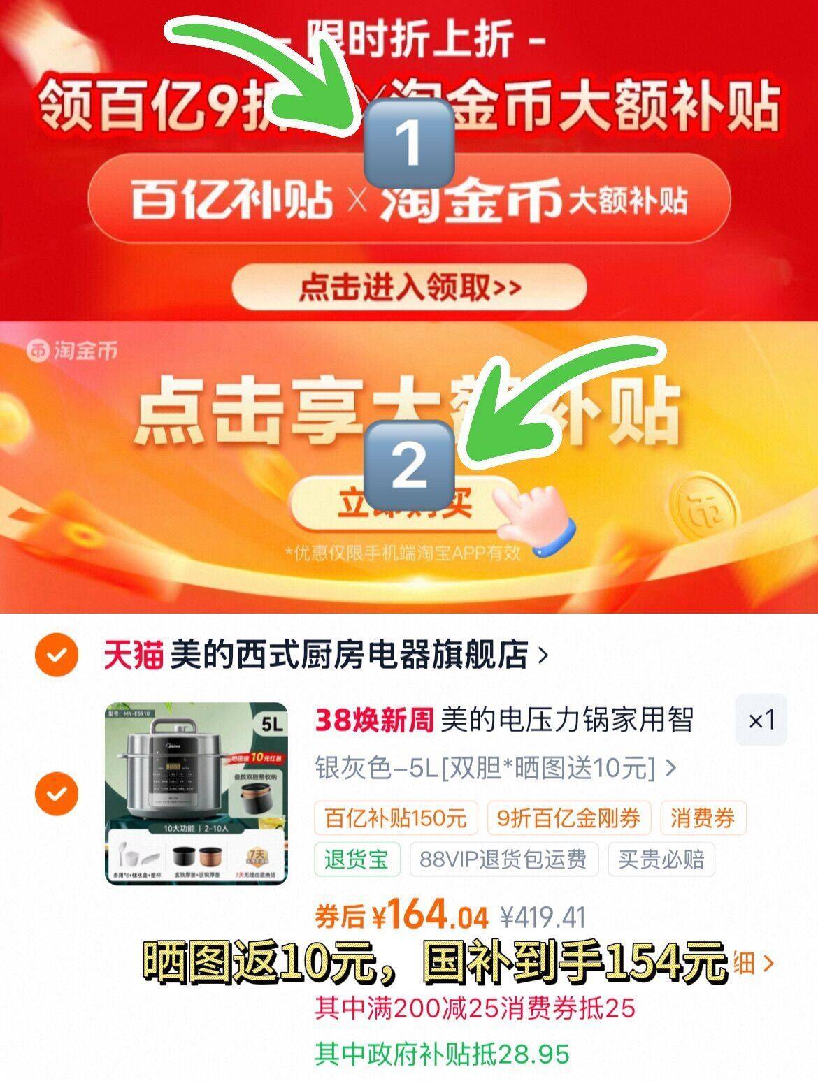 164-反10=154亓 美的 多功能电压力锅5L ①下拉领9折金刚券好单发报员2026年03月07日 13:410举报 164-反10=154亓美的 多功能电压力锅5L①下拉领9折金刚券②再下拉进淘金币,加1件https://m.tb.cn/h.iXNa13x复制文案