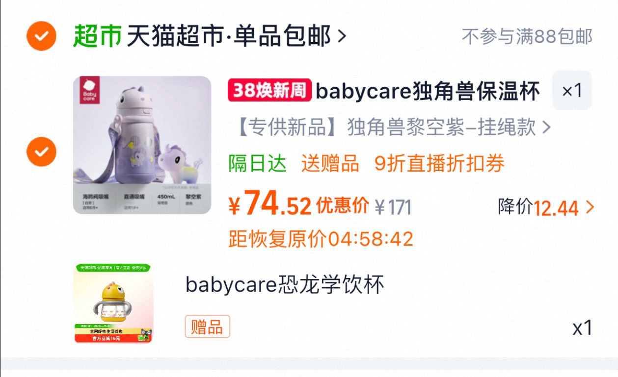 babycare独角兽儿童保温杯 赠学饮杯 下拉详情页进zbj加购一件 领9折主播奍 金币页面再加购一件 数量改1凑消费奍后74.6好单发报员2026年03月07日 13:550举报 babycare独角兽儿童保温杯 赠学饮杯下拉详情页进zbj加购一件 领9折主播奍金币页面再加购一件 数量改1凑消费奍后74.6https://m.tb.cn/h.i22nZIf凑1件https://m.tb.cn/h.i22Nt7z复制文案