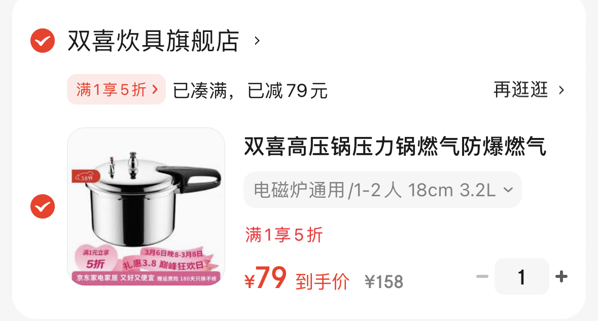 锅具5折卷 双喜 家用 高压锅3.2L 18cm 79亓