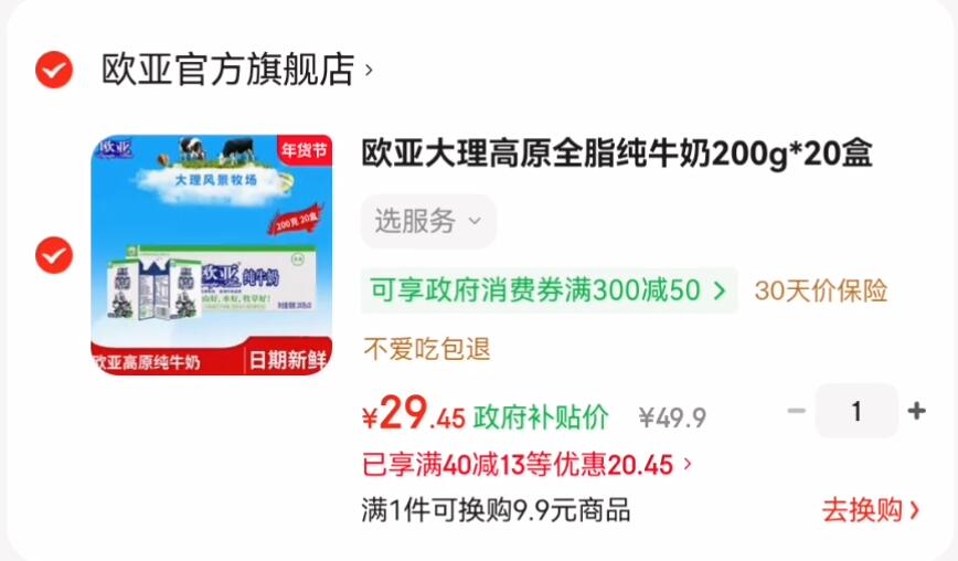 欧亚 全脂纯牛奶 200g*20盒