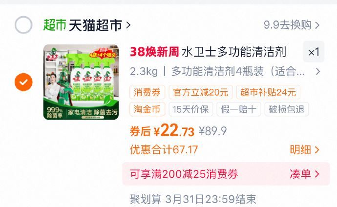 合理凑单用99-10购物券和红包,拍1件vip【22.73】