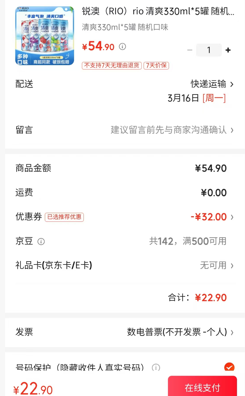 锐澳 清爽330ml*5罐【22.9】