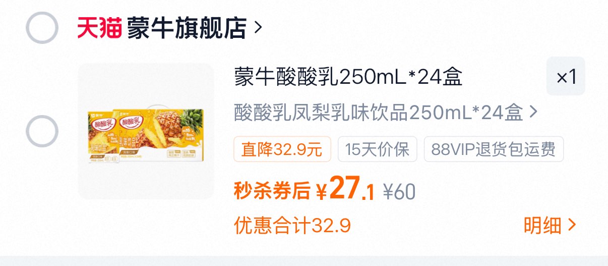蒙牛酸酸如饮品250mL*24盒 下拉详情秒杀后27.1元好单发报员2026年03月15日 17:040举报 蒙牛酸酸如饮品250mL*24盒下拉详情秒杀后27.1元https://m.tb.cn/h.ifeMMNS复制文案