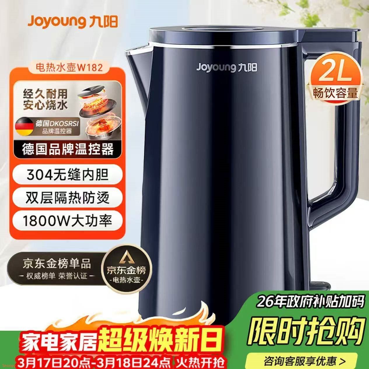 九阳 304不锈钢电热水壶 2L