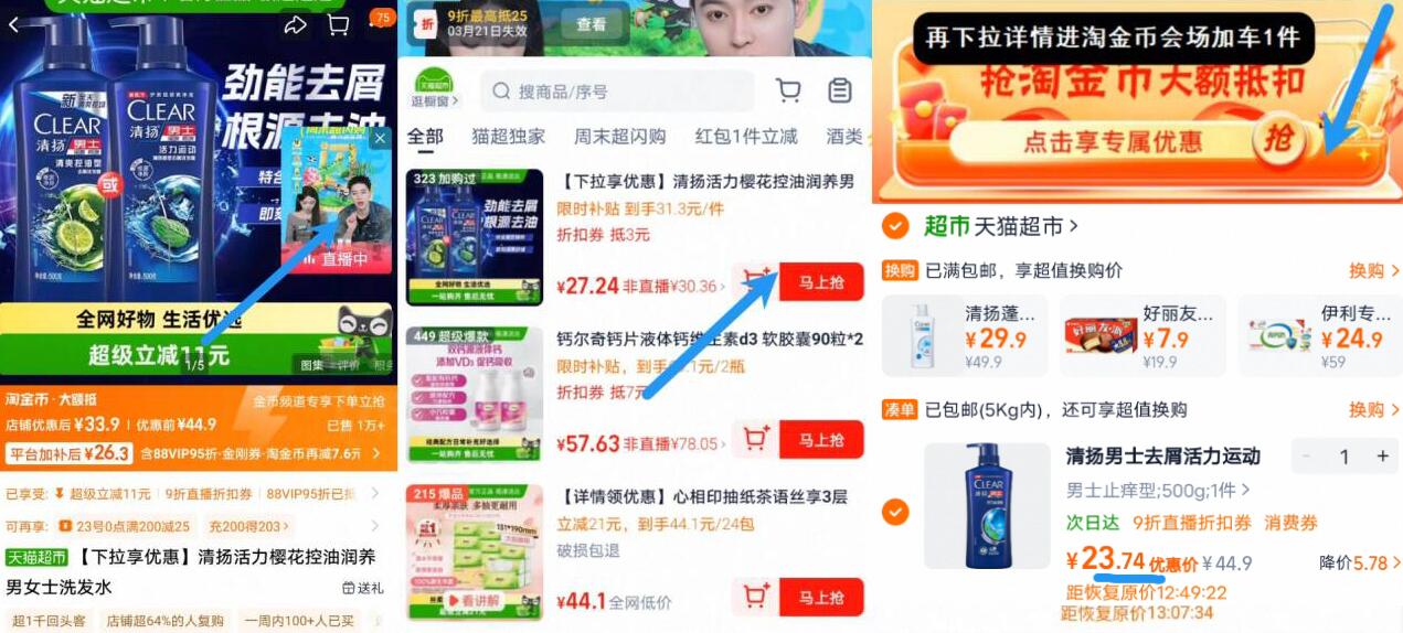①右上角进直播间等几秒领9折券