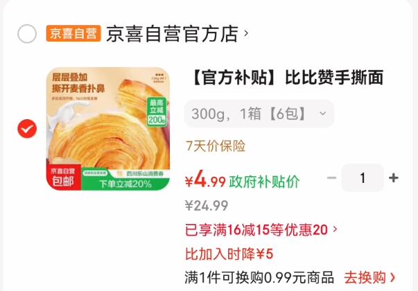 4.99元比比赞手撕面包300g/箱