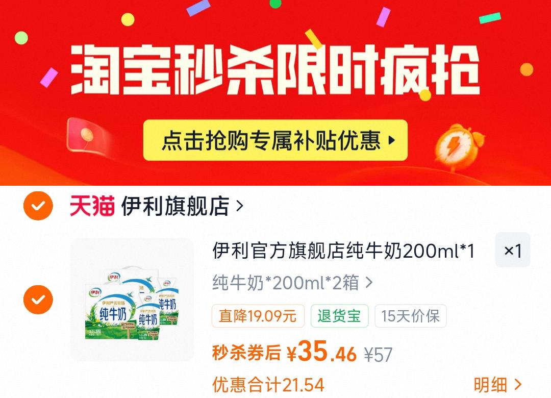 下拉拍 35.4元 折1.4元/盒 伊利纯牛奶200ml*12盒*2箱好单发报员2026年03月21日 14:510举报 下拉拍,35.4元 折1.4元/盒伊利纯牛奶200ml*12盒*2箱https://m.tb.cn/h.igILnvt复制文案