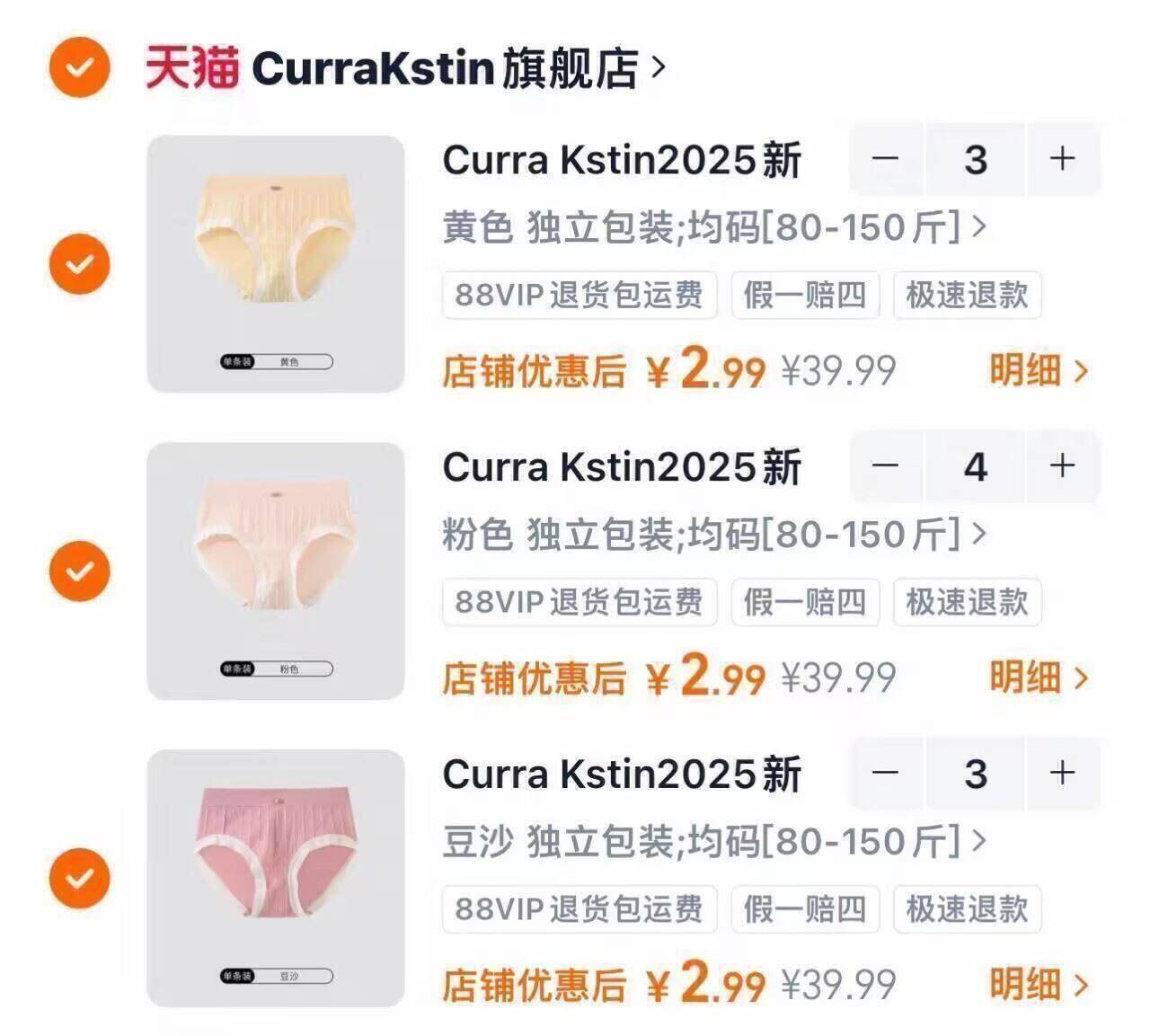 速2.9/条 29.9元拍10件 Curra Kstin女士无痕内裤 独立包装好单发报员2026年03月22日 11:490举报 速2.9/条 29.9元拍10件Curra Kstin女士无痕内裤独立包装~贴身衣物要常换备着https://m.tb.cn/h.i6l8aad复制文案