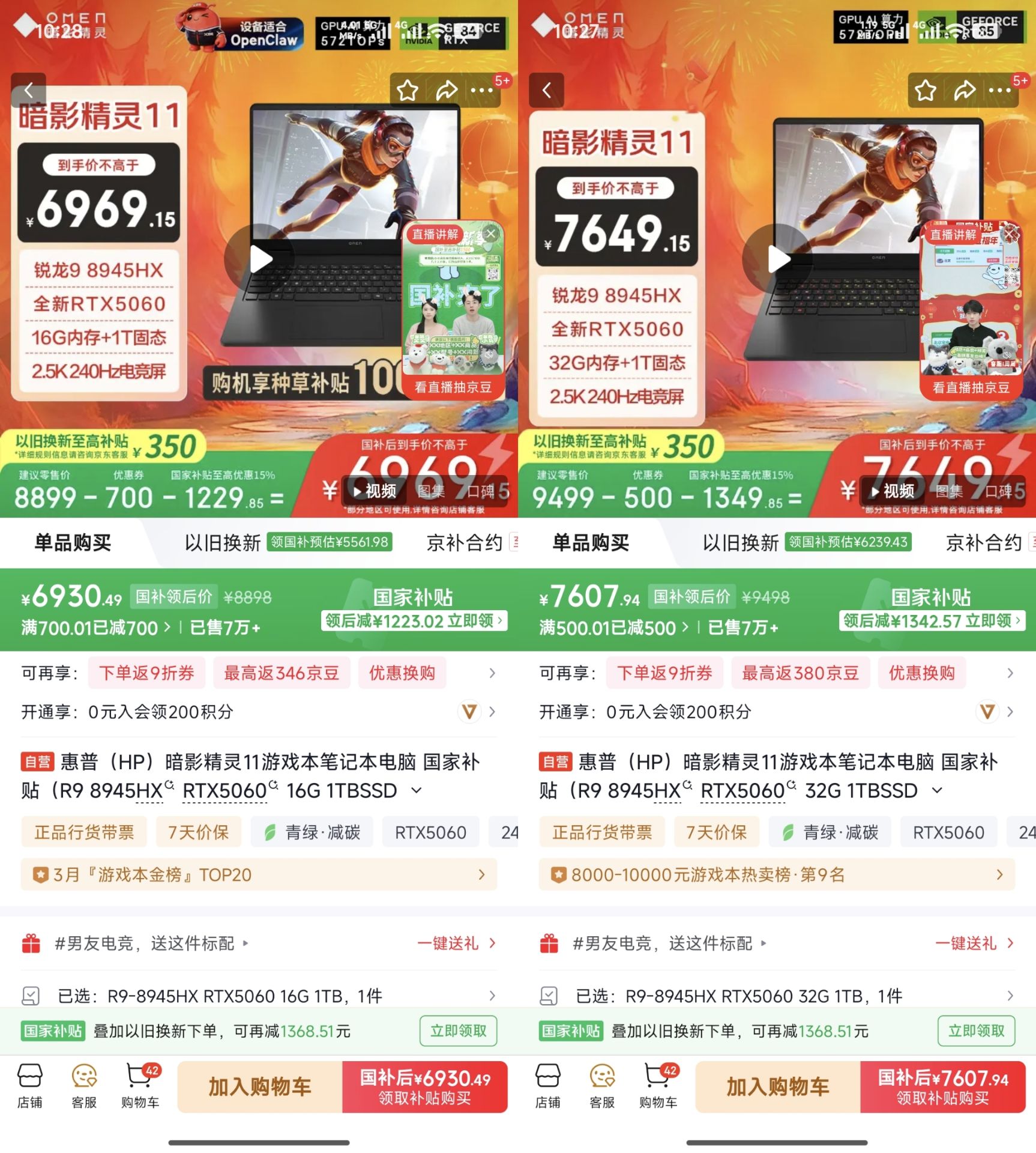 惠普暗影精灵11 8945HX、5060 16 1T 6930元,32 1T 7607元 好单发报员 2026年03月26日 10:42 0 举报 惠普暗影精灵11 (8945HX、5060)16 1T【6930】32 1T【7607】https://u.jd.com/crDhKn9 复制文案