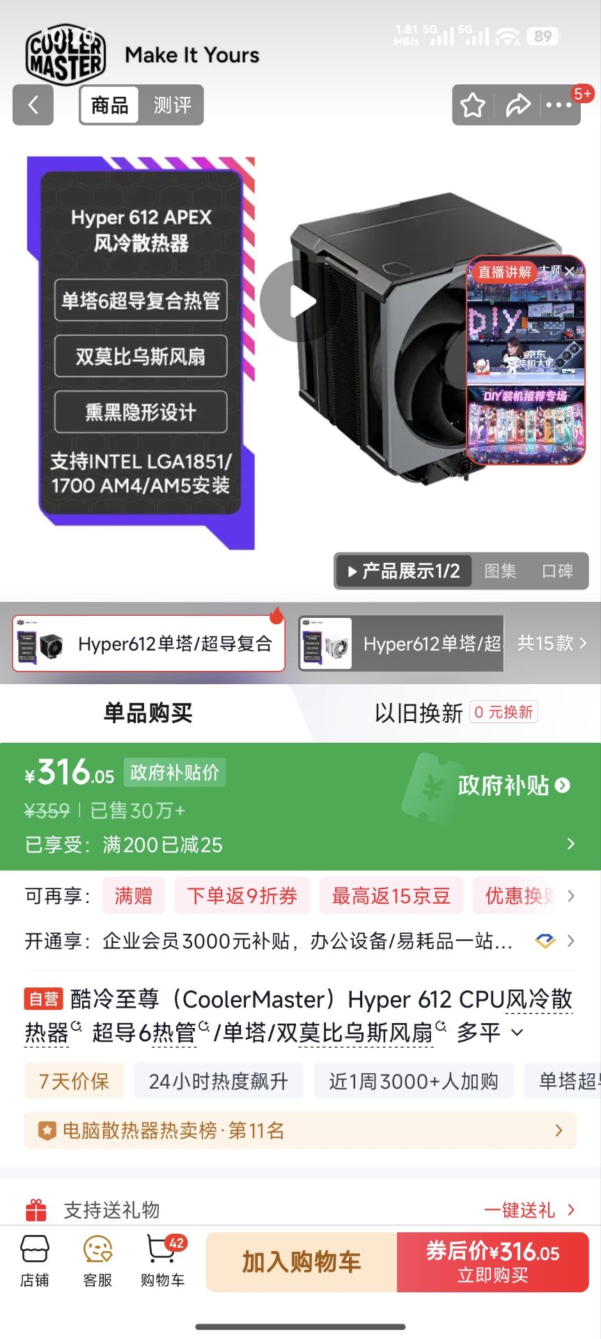 酷冷至尊612风冷散热器 316元