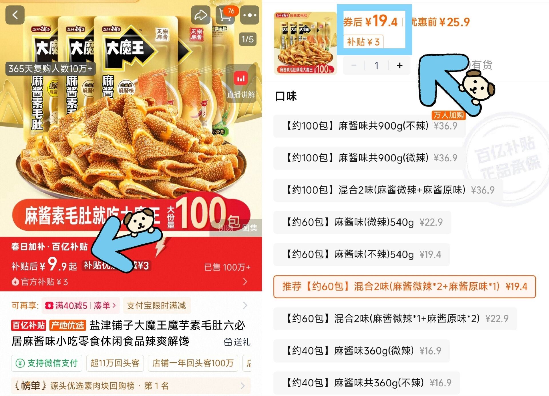 盐津铺子大魔王毛肚任选60包 19.4元 好单发报员 2026年03月27日 18:55 0 举报 3毛/包快撸限时百亿补贴拍60包选项!到手19.4元!---盐津铺子大魔王毛肚共60包复制这条信息打开手机陶宝https://m.tb.cn/h.iix7Ghi多口味任选,比杂牌还便宜 复制文案