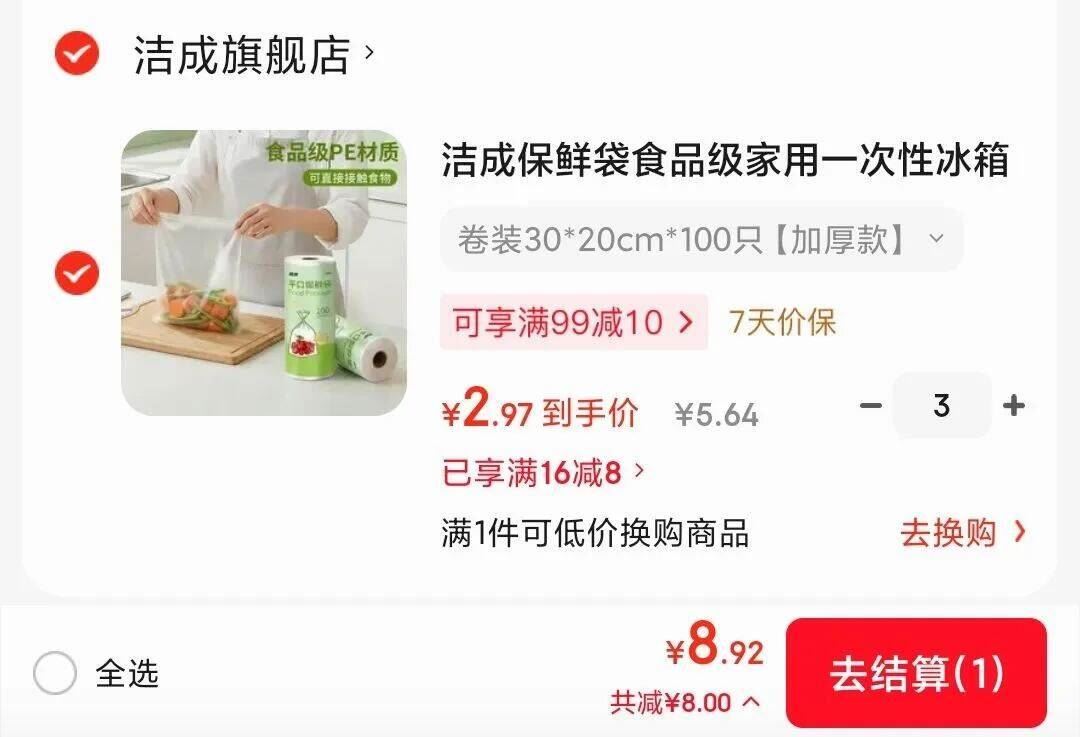 洁成家用食品级加厚保鲜袋30*20cm*100只 拍3件 8.92元好单发报员2026年04月02日 20:190举报 2.97元/件!拍3件8.92元洁成 家用食品级加厚保鲜袋 30*20cm*100只https://u.jd.com/caXUP4W 可直接装食物 官旗好价~复制文案
