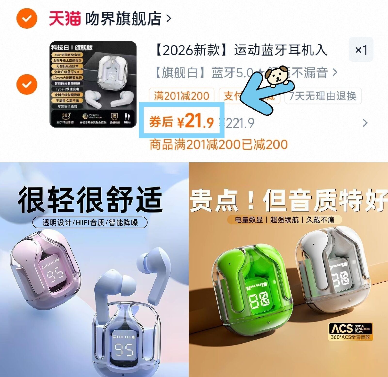 数显长续航透明运动蓝牙耳机 21.9元好单发报员2026年04月02日 20:330举报 21.9元神价锁 耳机控福音!颜值音质在线 运动健身必备---数显长续航透明运动蓝牙耳机复制这条信息打开手机陶宝https://m.tb.cn/h.ikzGlBZ续航能力杠杠滴 对懒人友好复制文案
