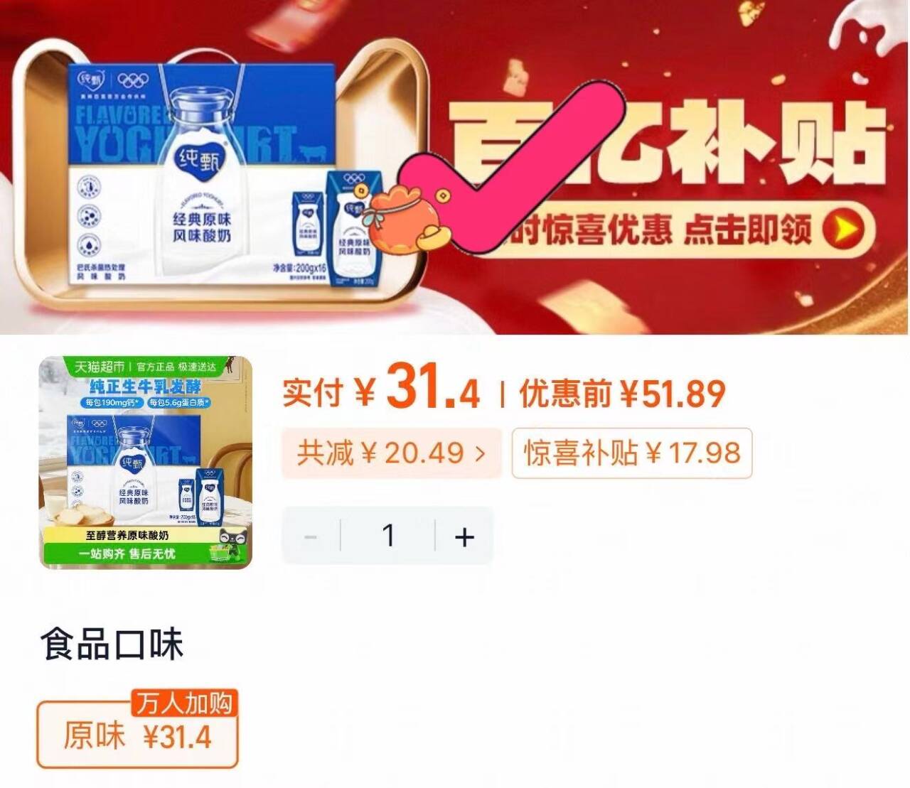 蒙牛纯甄原味酸奶200g*16盒 31.4元好单发报员2026年04月02日 21:550举报 速 蒙牛纯甄原味酸奶200g16盒下拉拍31.4元1.9/盒 口感丝滑浓郁大人小孩都爱喝平时没有活.动卖的超贵快撸https://m.tb.cn/h.iPZkvnU复制文案