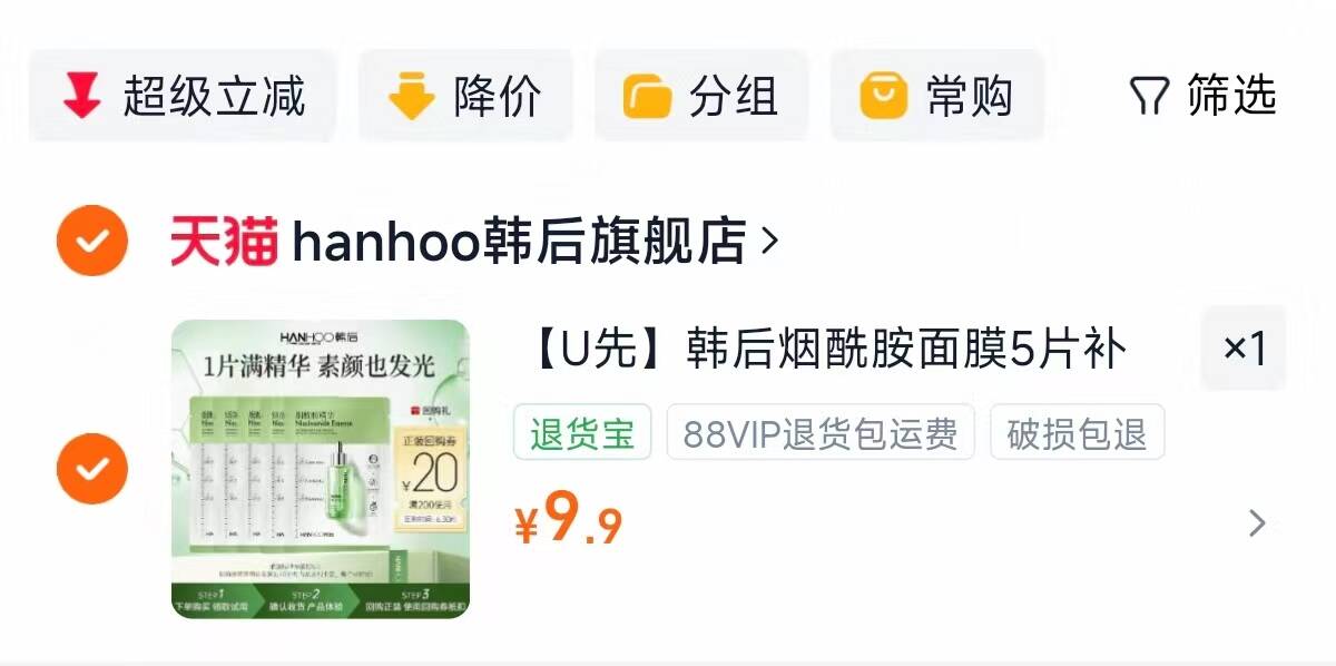 韩后烟酰胺面膜5片 9.9元好单发报员2026年04月02日 22:030举报 速 韩后烟酰胺面.膜5片拍下到手9.9元1.9/片 平忦黑马!!非常布水!!https://m.tb.cn/h.iQJwmfX复制文案