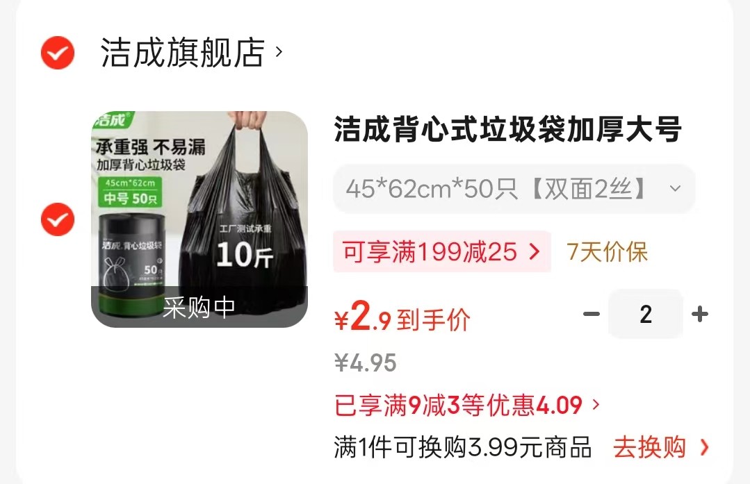 洁成 背心垃圾袋加厚手提45*62cm*50只,拍2件【5.9】