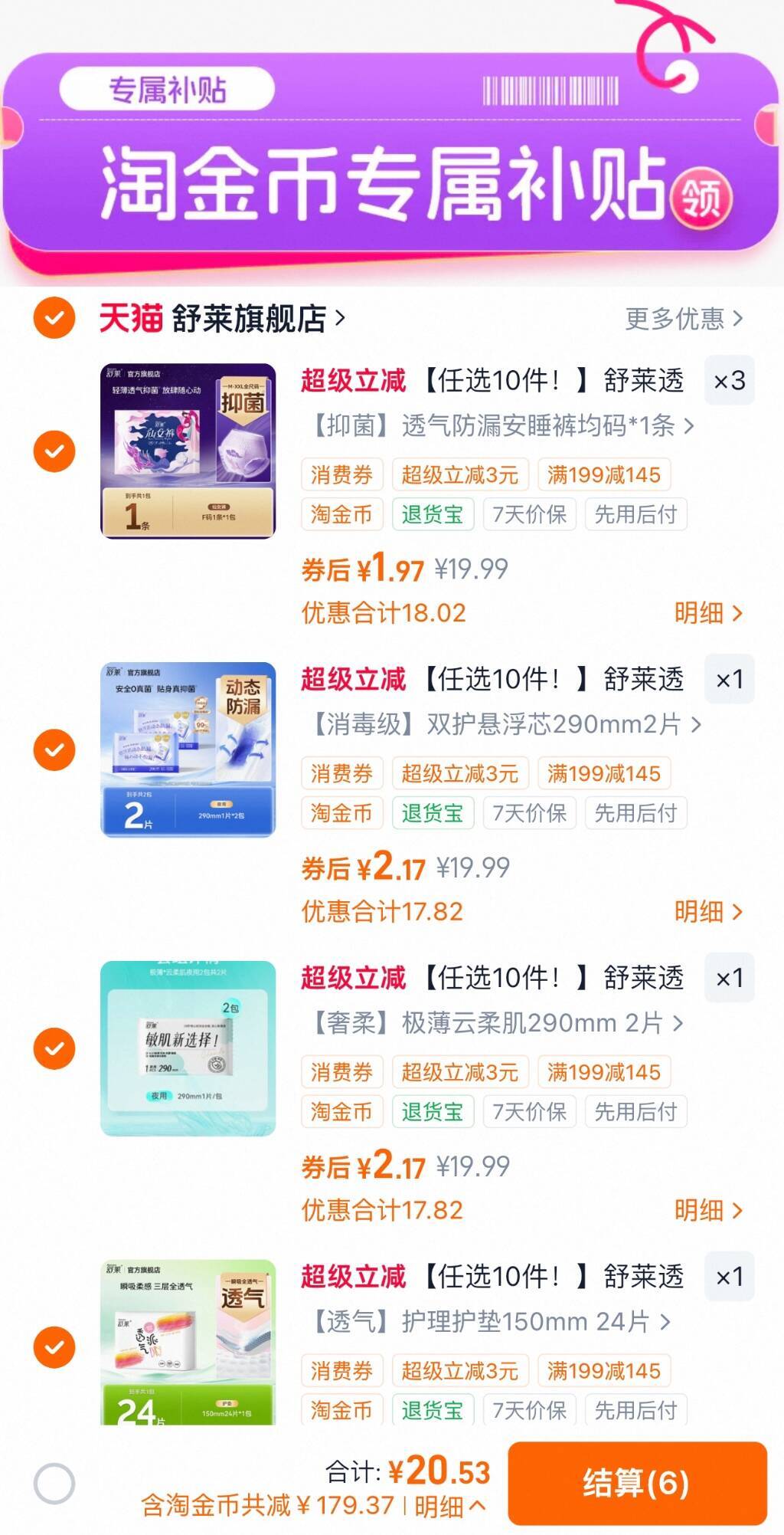 舒莱卫生巾任选10件 2元/件好单发报员2026年04月04日 16:340举报 bug 舒莱卫生巾神车任选10件20,才 2元/件线下超市一包至少要10几块 下拉详情补贴入口去拍https://m.tb.cn/h.iliXRFY复制文案
