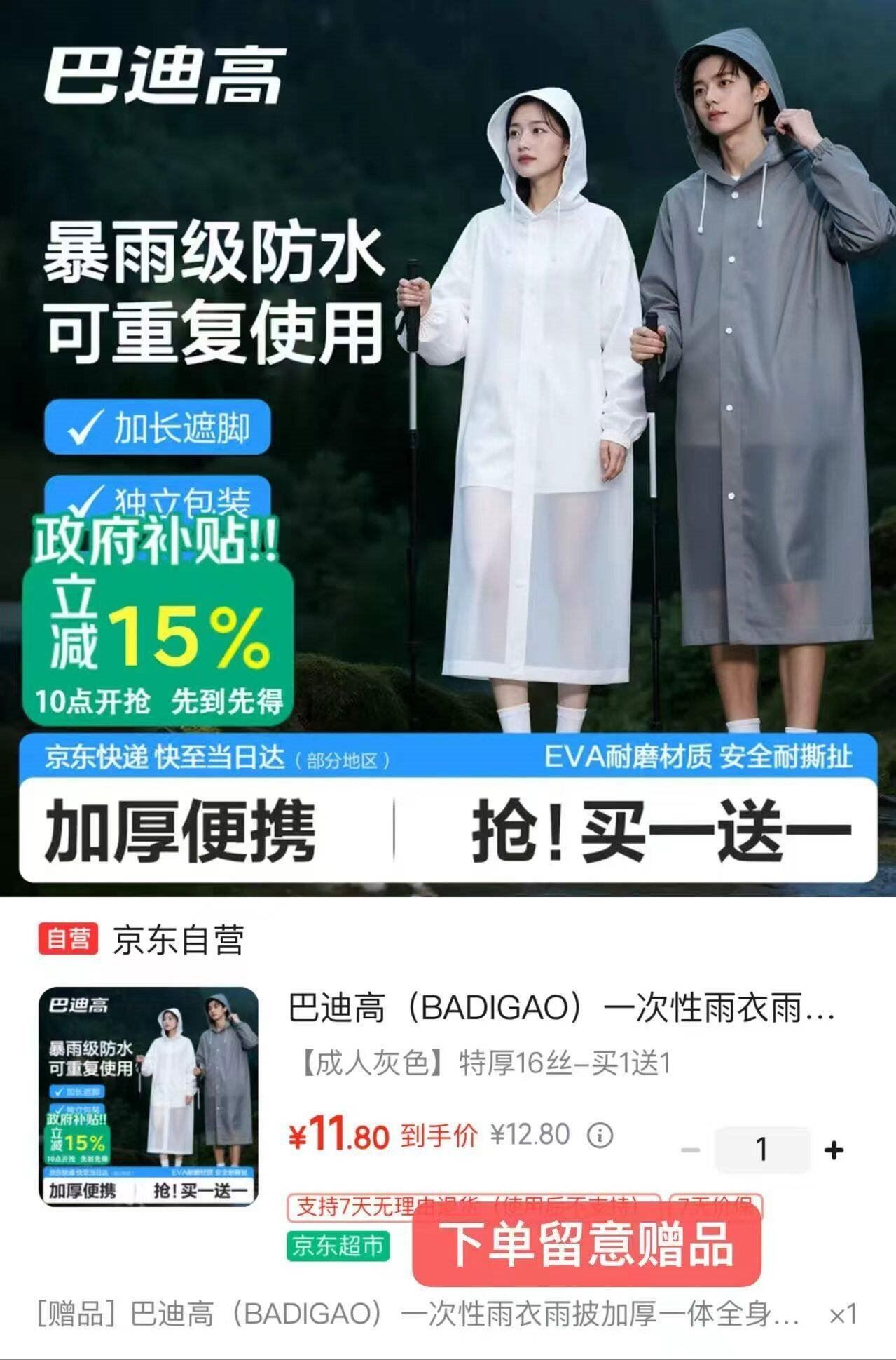 巴迪高一次性加厚全身雨衣 买1赠1 12.8元好单发报员2026年04月04日 19:090举报 ——巴迪高雨衣买1贈1——【自营】一次性加厚全身雨衣https://u.jd.com/cD57w87 12.8元 U,Plus新客11.8元*TPE材质能耐用 以备不时之需复制文案