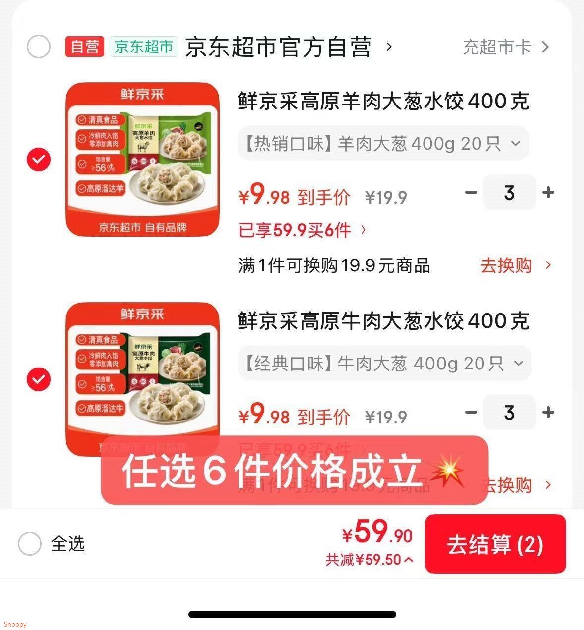 鲜京采牛肉/羊肉大葱水饺400g任选6件59.9元好单发报员2026年04月04日 19:230举报 ——鲜京采水饺发車——鲜京采 牛肉/羊肉大葱水饺400ghttps://u.jd.com/ca5eBJ0 https://u.jd.com/c65XMxL 任选6件59.9元,折9.9元/件*传统手工包 每口都是大颗肉馅复制文案