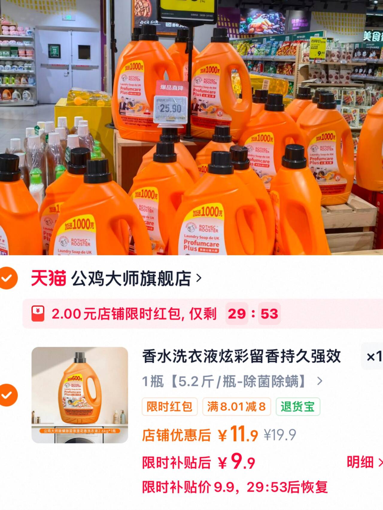 公鸡大师香氛洗衣液5.2斤 9.9元,公鸡大师香氛洗衣液5.2斤 25.9元发报员Z2026年04月10日 20:260举报 公鸡大师香氛洗衣液5.2斤速现在弹2限时 9.9啇超品牌超市25.9一桶啊0¥gRZ95foJLnq¥/复制文案