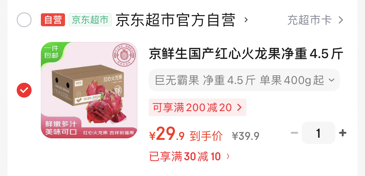 【包u】京鲜生 红心火龙果 净重4.5斤