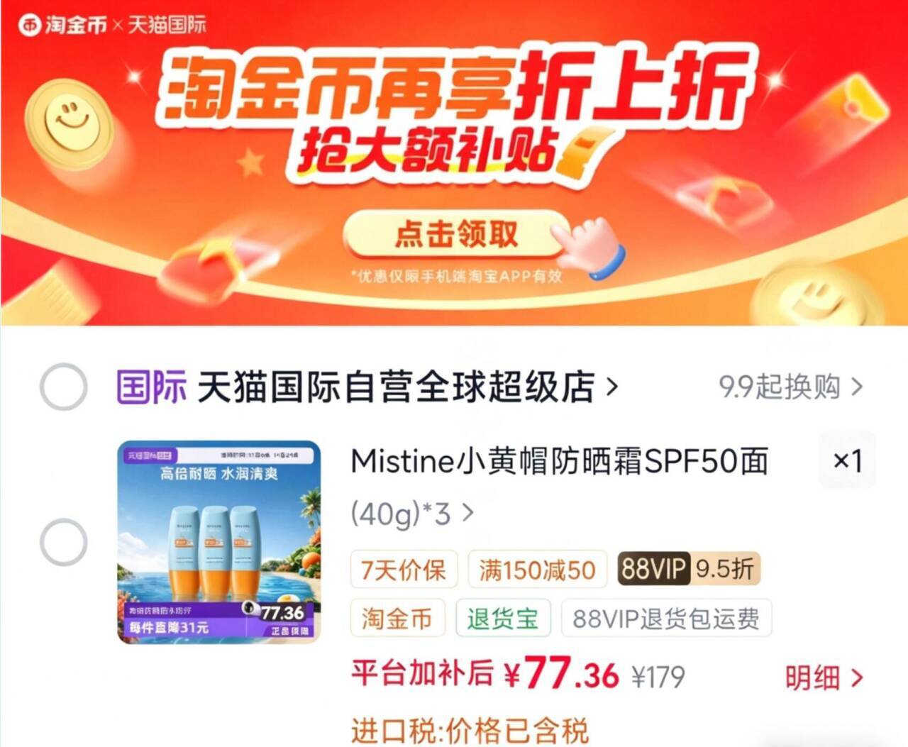 蜜丝婷小黄帽防晒霜40ml*3支 77.3元发报员Z2026年04月11日 10:120举报 下拉详情拍限时 77.3元,折25.7元/支 蜜丝婷小黄帽防晒霜40ml*3支https://m.tb.cn/h.inxnIs0复制文案