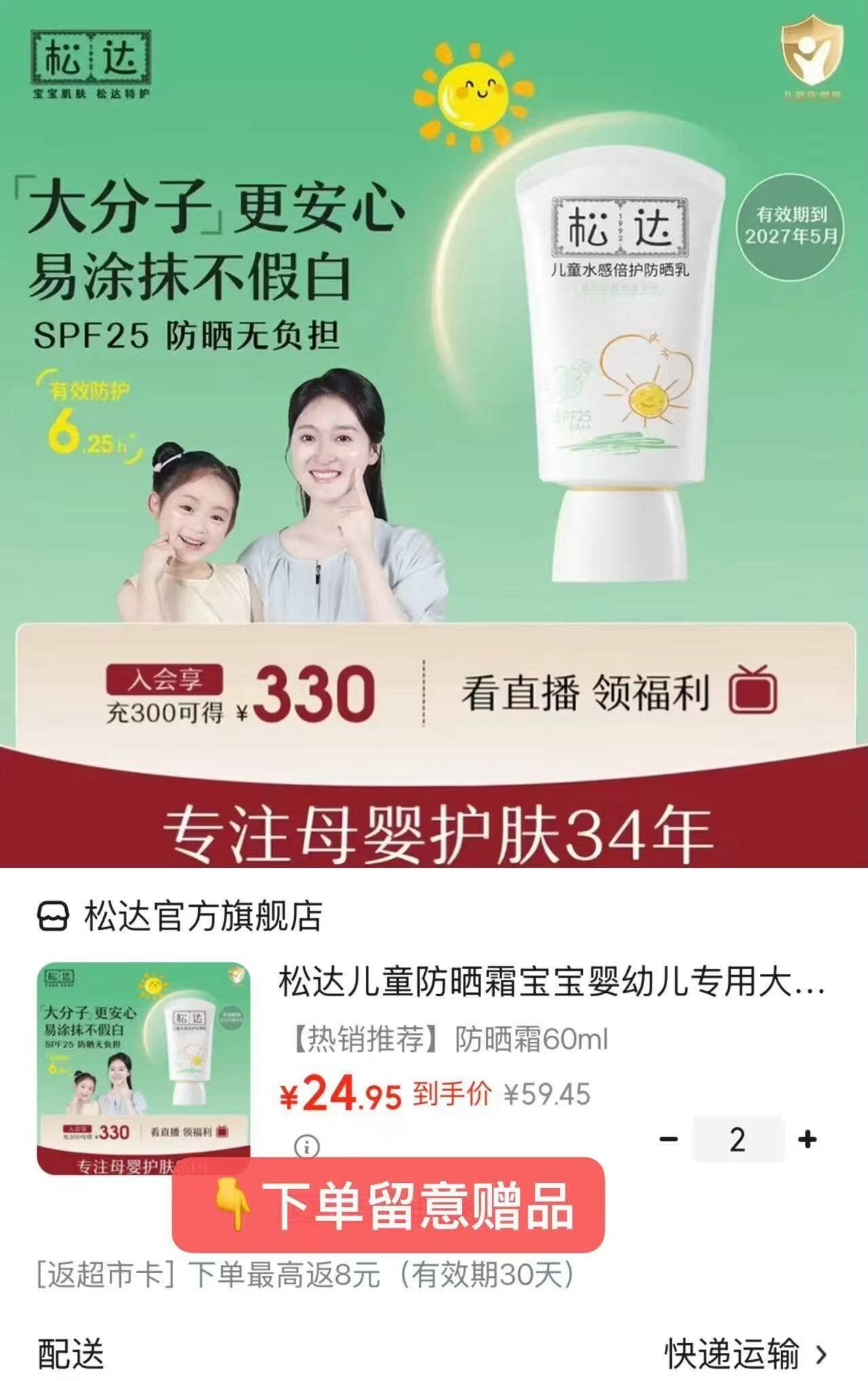 松达儿童专用防晒霜60ml/支 买2件 49.9元发报员Z2026年04月11日 11:030举报 ——速 松达防晒lou了——松达 儿童专用防晒霜60ml/支https://u.jd.com/j1agHb0 买2件49.9元,贈8元超市卡*才20.9/支 大支装的巨划算*夏天防晒必备 手慢涨忦 快快复制文案