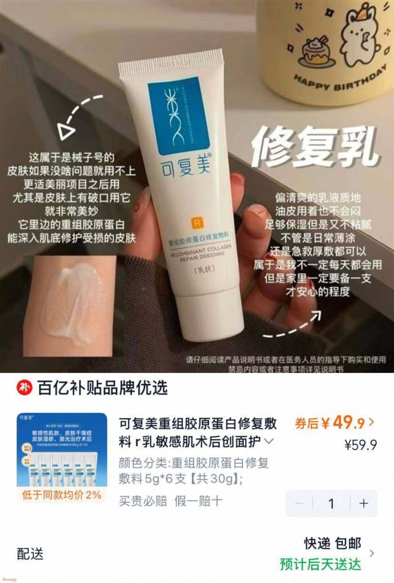 可复美重组胶原蛋白敷料 5g*6共30g 49.9元发报员Z2026年04月11日 21:360举报 49.9元5g*6共30g 8.3/支可复美重组胶原蛋白敷料神 简直是修复天花板!院线同歀https://m.tb.cn/h.io987n1复制文案