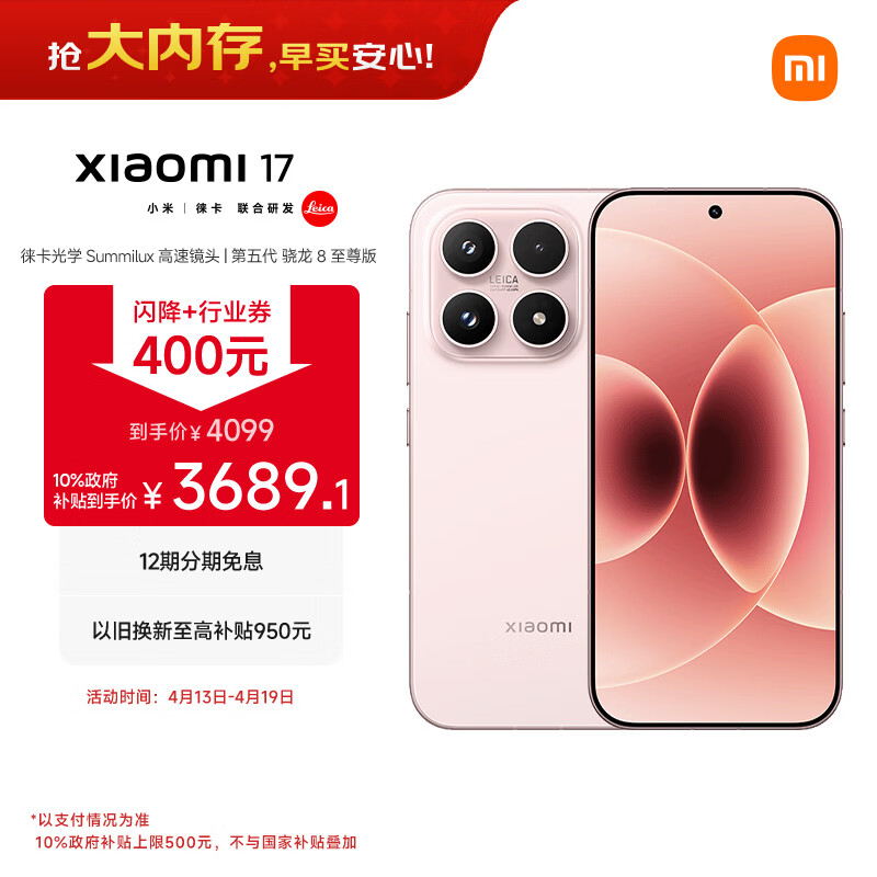 【3599】小米 17 骁龙8至尊版12GB 256GB,限部分地区国补