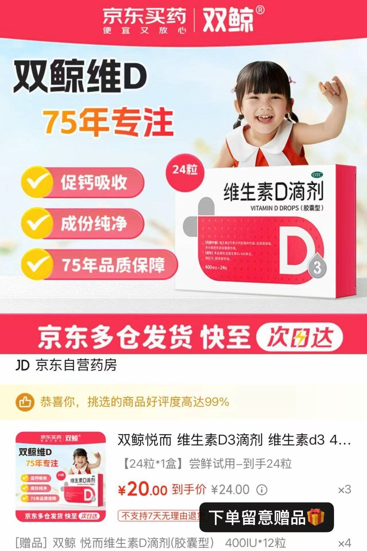 双鲸维D3滴剂24粒 买3件实付60元,赠同款48粒发报员Z2026年04月14日 16:330举报 ——儿童维D发車——【自营】双鲸 维D3滴剂24粒https://u.jd.com/jDS6ZYw买3件实付60元,贈同歀48粒*折0.5元/粒 补足每日所需维D复制文案