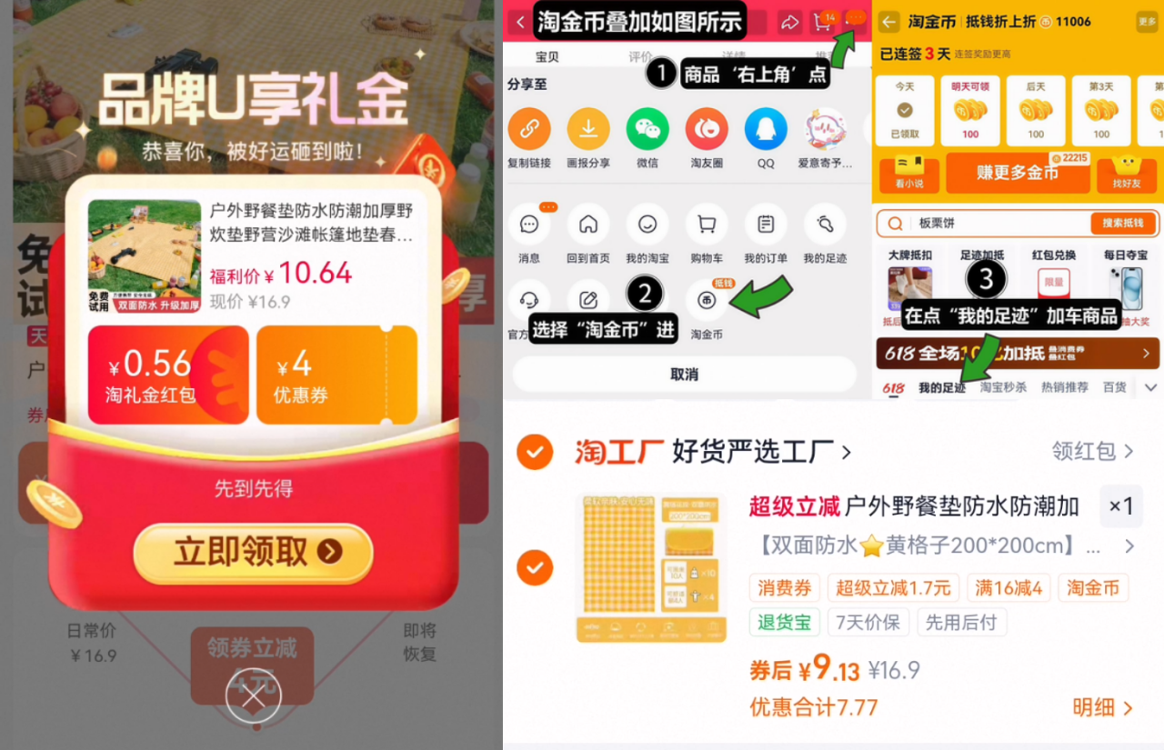 户外防潮垫加厚野餐垫200*200cm 1.5元发报员Z2026年04月14日 17:590举报 9元速度!当一次性都值叠限时礼金 1.5元淘金币户外防潮垫加厚野餐垫200*200cm①如图点右上角3个点,选淘金币②选我的足迹-找到商品拍https://m.tb.cn/h.iptVDIA复制文案