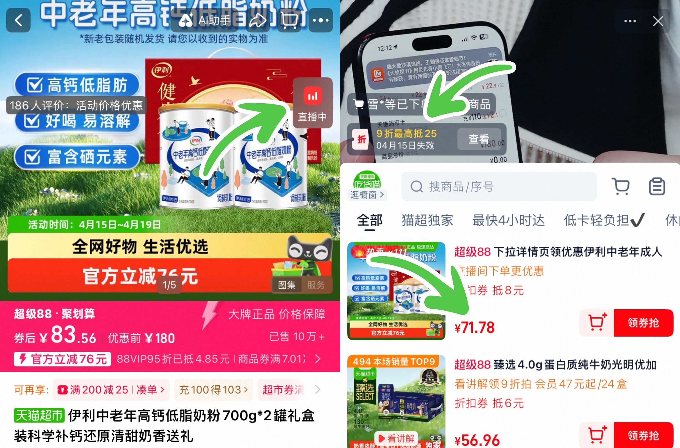 伊利高钙低脂奶粉700g*2罐 41.8元 发报员Z 2026年04月15日 12:20 0 举报 速!41.8元,折20.9元/罐 好价伊利 高钙低脂奶粉700g*2罐①右上角进直播,领9折券加1件②再下拉进淘金币,加1件③购物车数量修改‘1’https://m.tb.cn/h.ioAKoiu 复制文案