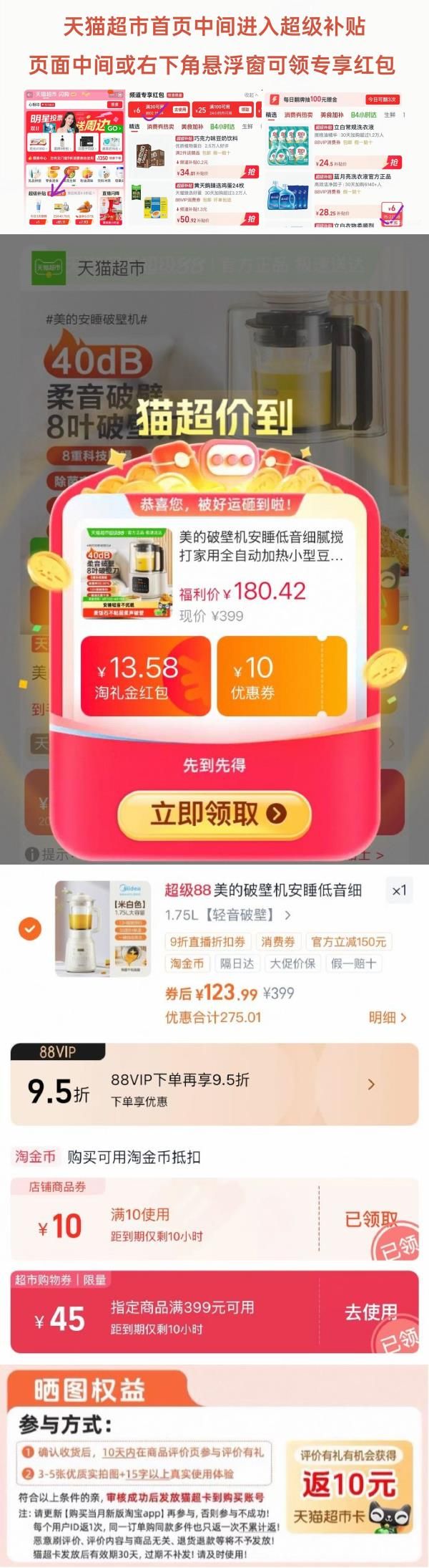 ②详情页进入超级补贴领199-30红包,再加购商品