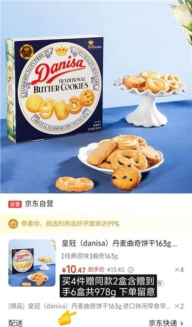 皇冠丹麦曲奇饼干163g 买4件42.8元,赠同款2盒发报员Z2026年04月18日 17:490举报 ——皇冠 曲奇shen价——【自营】丹麦曲奇饼干163ghttps://u.jd.com/jDRYEbS 买4件42.8包U,贈同歀2盒*含贈到手共6盒 总共978g*正常900多g都要一百多 复制文案