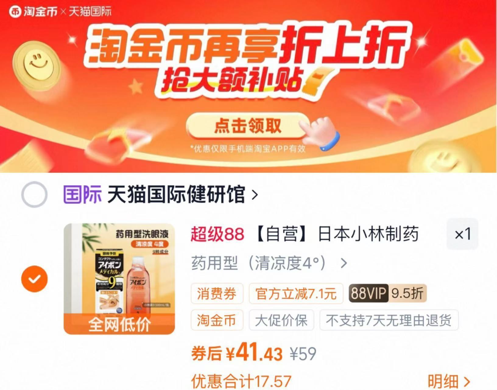 日本小林制药洗眼液500ml 41.4元发报员Z2026年04月18日 18:080举报 速 日本小林制药洗眼液 下拉详情41.4元 500ml手机党美瞳党注意 好价 大容量用好久 疲劳干涩常备-https://m.tb.cn/h.iJX9uwG复制文案