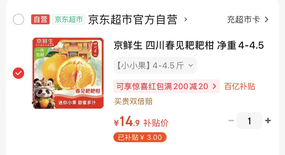 京鲜生四川春见耙耙柑 净重4-4.5斤 14.9元