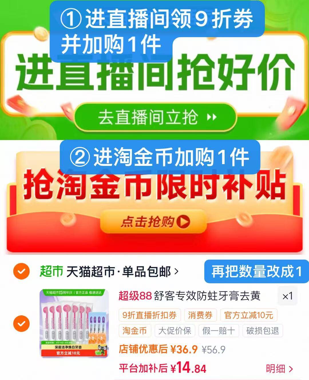 14.8元 1 下拉进直博间领9折劵并加购 2 再点淘唫币加购1件 3 发报员Z 2026年04月19日 16:26 0 举报 14.8元 1、下拉进直博间领9折劵并加购2、再点淘唫币加购1件3、最后数量改为“1”-舒客 牙膏140g*4 漱口水12ml*4条https://m.tb.cn/h.iqmEAmW 复制文案