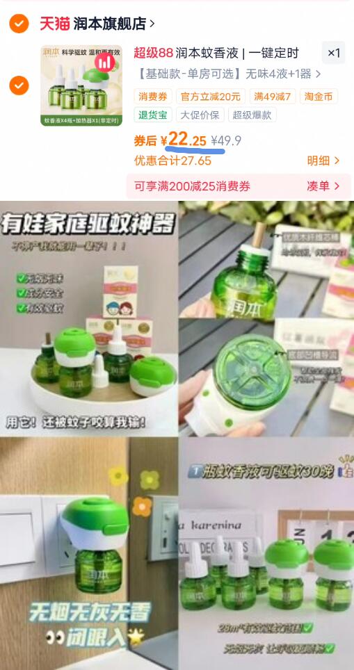 润本无烟无味蚊香液4液1器 22元,润本无烟无味蚊香液4液1器 49.9元发报员Z2026年04月19日 18:500举报 22元好圿 怕愿圿49.9元选项【润本】无烟无味蚊香液4液 1器https://m.tb.cn/h.iJULzce天越来越热了!抓紧囤起来精纯无香!婴儿孕妇都能使用!复制文案