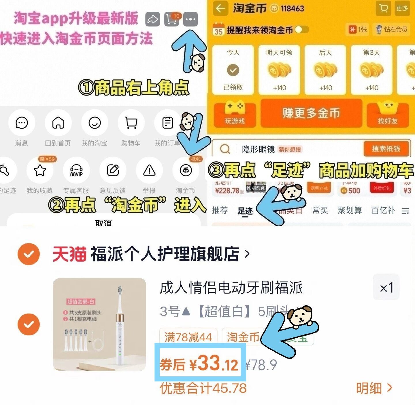 ①如图点右上角3个点选淘金币