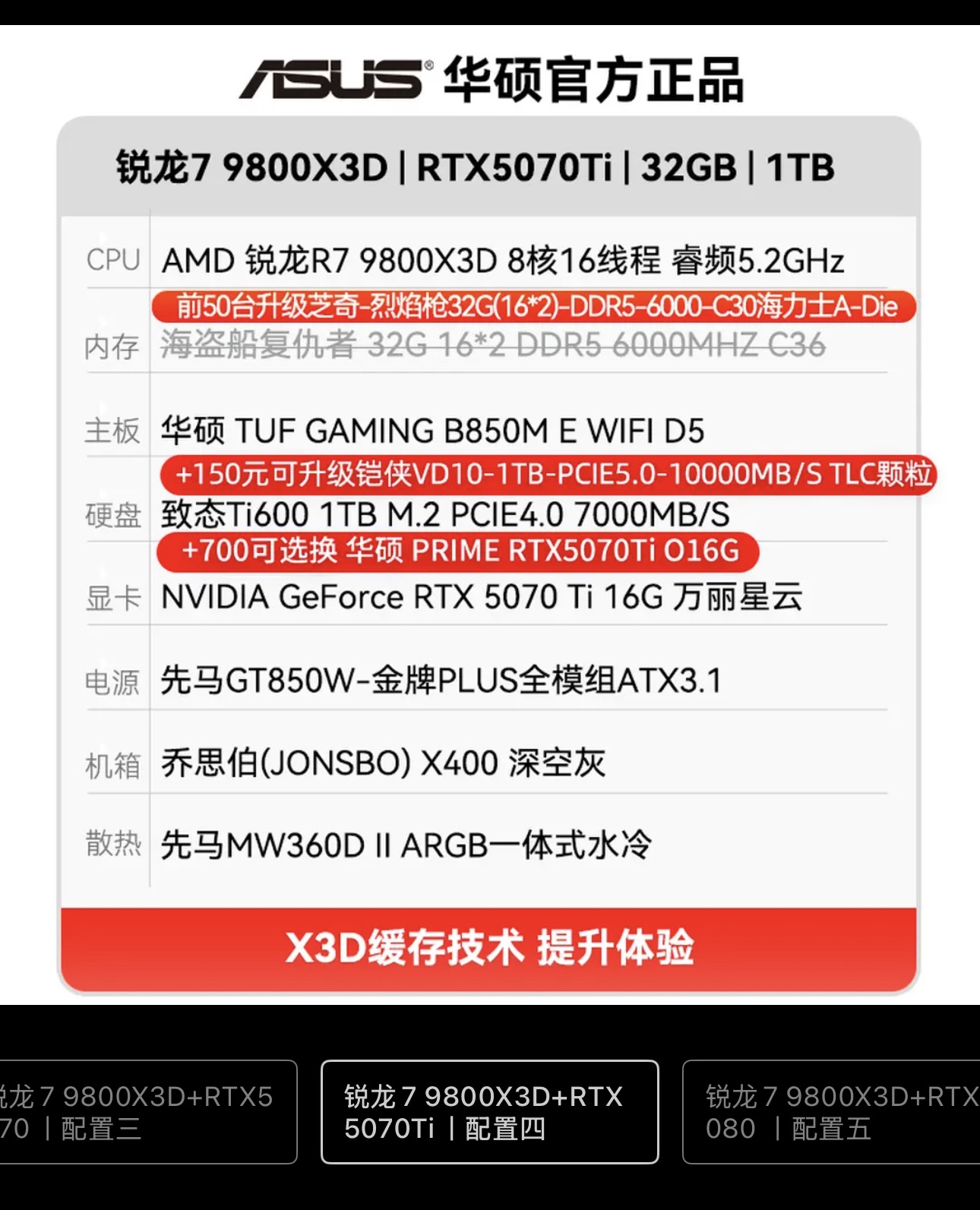 华硕电脑整机 9800X3D 5070Ti 配置四 12999元发报员Z2026年04月23日 17:420举报 18点开抢 【12999】华硕电脑整机 ,9800X3D 5070Ti ,配置四 ,https://u.jd.com/f1L95sc商品页面右上角进值播间下箪才成立复制文案