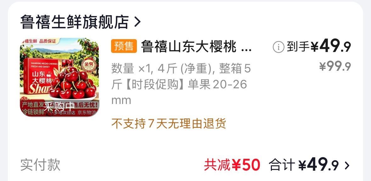 山东大樱桃5斤 49.9元