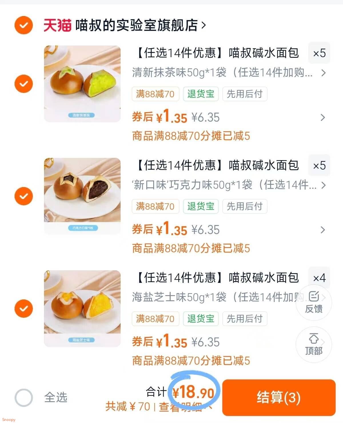 喵叔实验室碱水面包任选14件 18.9元发报员Z2026年04月25日 17:180举报 1.3/个 喵叔实验室碱水面包 任选14件18.9元 现做现发减脂期也能吃 好吃也没负担 https://m.tb.cn/h.itA1wsB复制文案