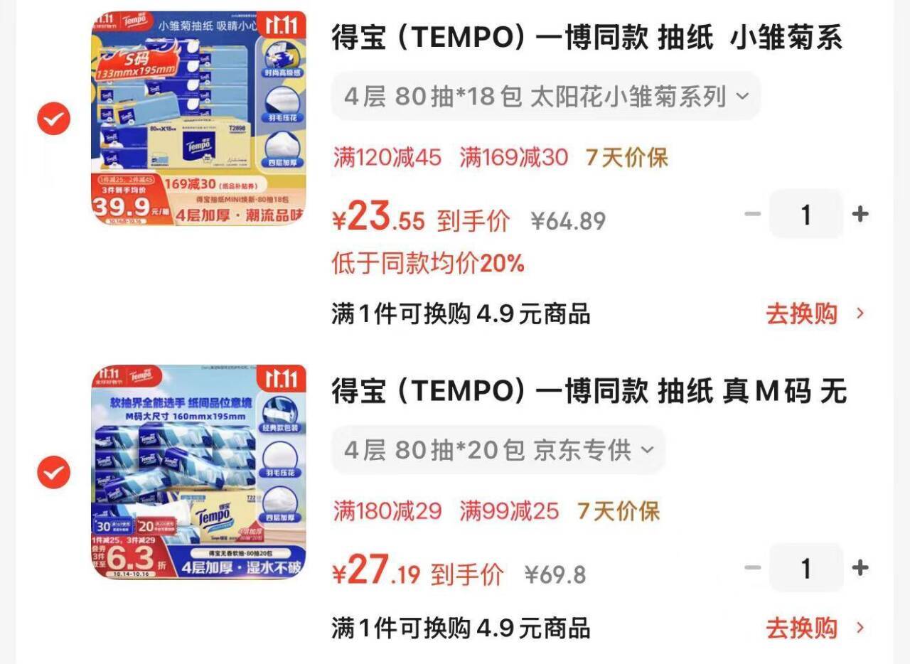 各一件 得宝抽纸价格如图