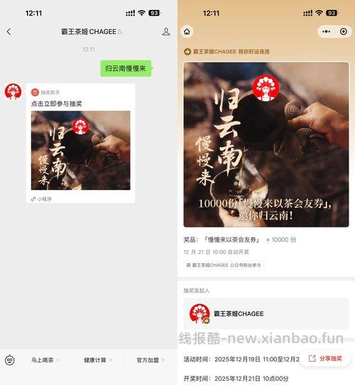微信关注#公众号:霸王茶姬CHAGEE ->回复“归云南慢慢来”->12月21日10点整开,抽1万张免单券