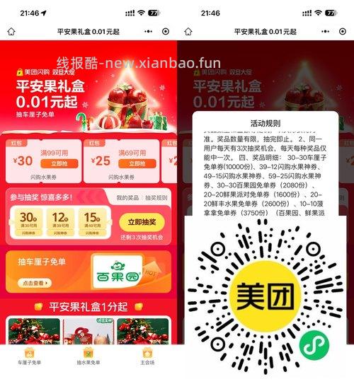 【美团双旦抽1万份车厘子免单】微信打开活动->每天有3次机会,抽1万份车厘子免单,以及鲜果免单券